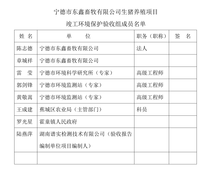 附:寧德市東鑫畜牧有限公司生豬養(yǎng)殖項(xiàng)目竣工環(huán)境保護(hù)驗(yàn)收組成員名單2017年10月27日